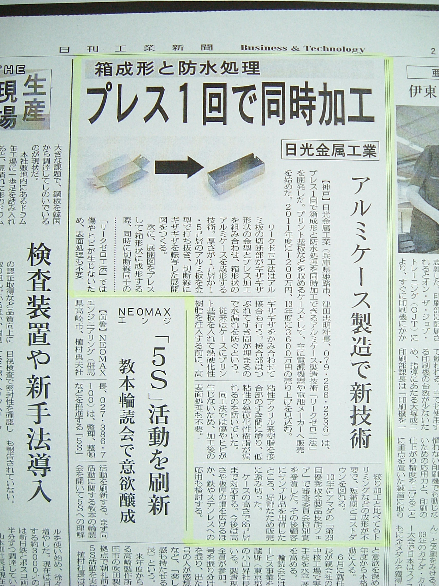 本日(2011年8月11日)、日刊工業新聞の朝刊にリークゼロ工法の記事が掲載されました。タイトル「アルミケース製造で新技術」
